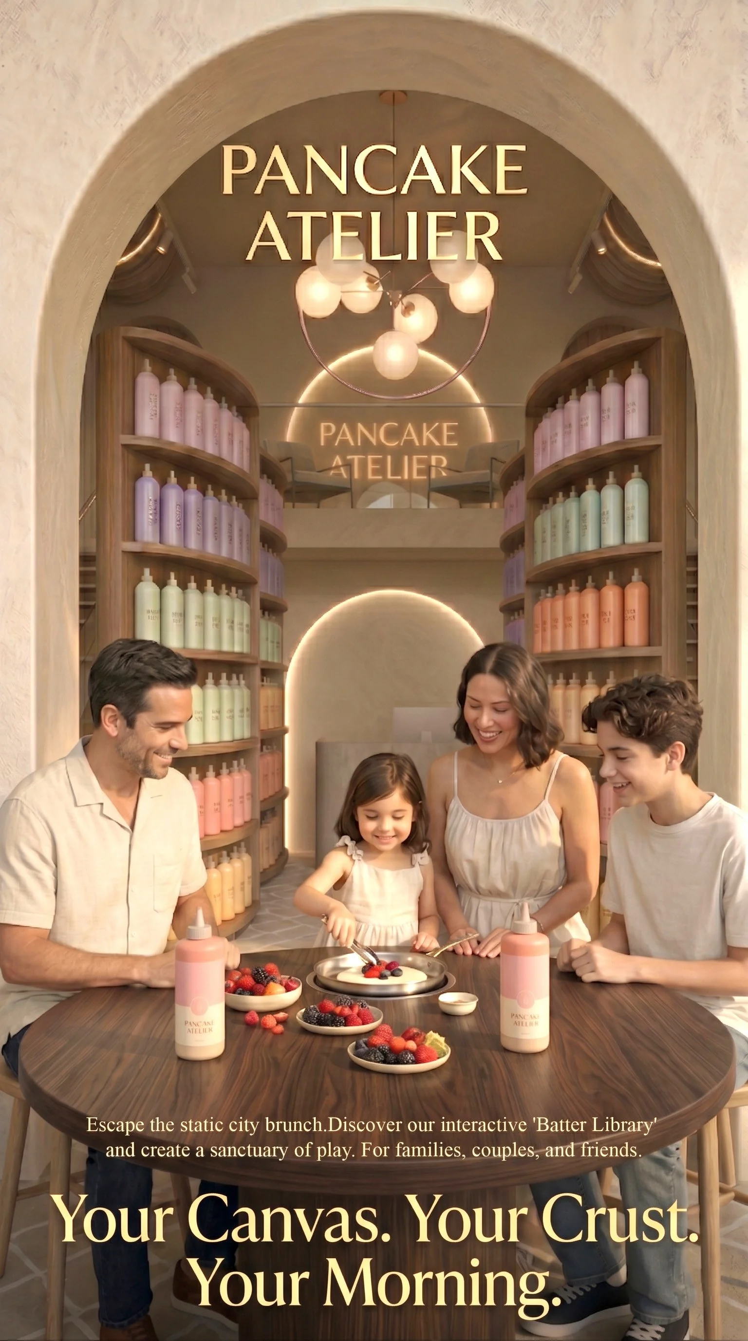 My strategy focused on the "Batter Library", a curated, interactive feature that serves as the heart of the restaurant. By allowing families to choose their own batter flavors and seasonal fruits from a visually stunning, organized display, I transformed the act of ordering into a moment of discovery. I moved the focus away from the typical fast-paced service and emphasized the "making" process, using a POV-driven visual narrative that highlights the hands-on fun of pouring batter and customizing plates in a space that feels curated, quiet, and contemporary.